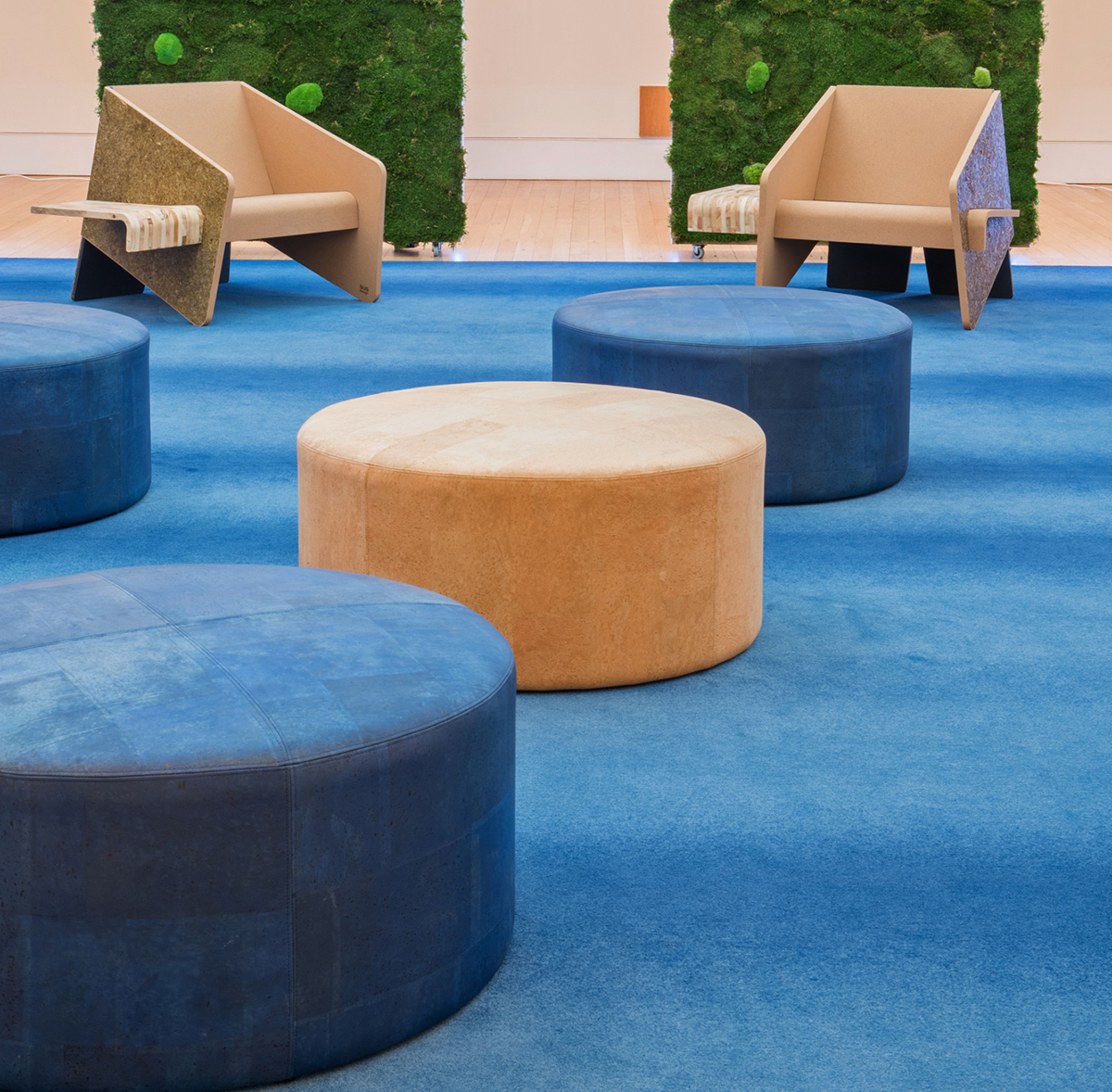 The Dot puff was designed for the lounges of the 2021 Portuguese Presidency of the Council of the European Union. In keeping with the “oceans” and the “Portuguese forests” themes of the PPUE 2021, the puff utilizes cork leather in gold and blue tones. The Dot puff uses low density eco-foam as the filling, and low impact woods for the structure, and can be built to size.