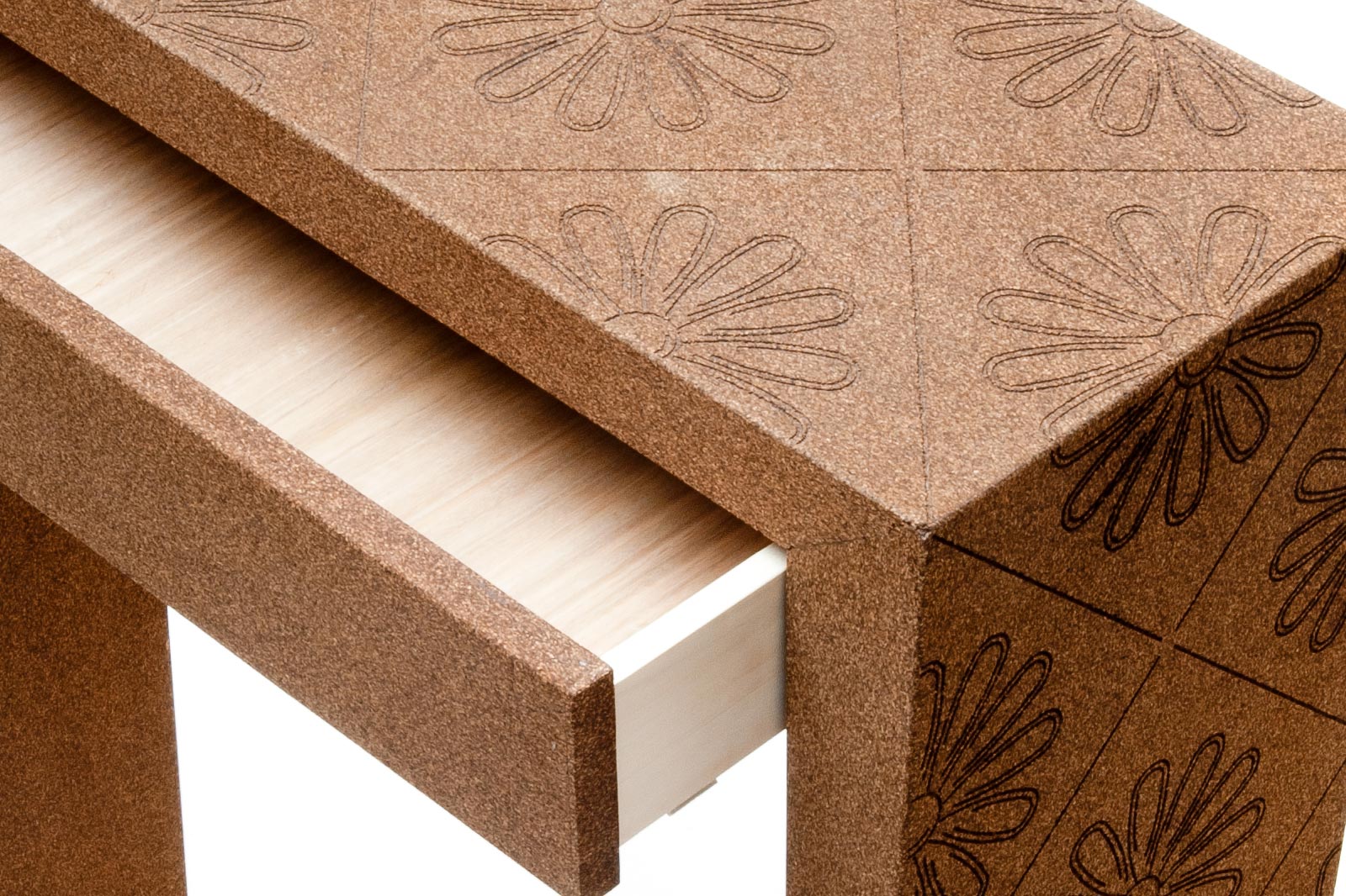 The Black Flower is a cork sideboard piece with flower illustrations in base-relief, giving it a special refined texture. The black agglomerate cork is a natural chromatic change derived from a non toxic process of heating the cork in high temperatures, which results in a beautiful black “roasted” look.