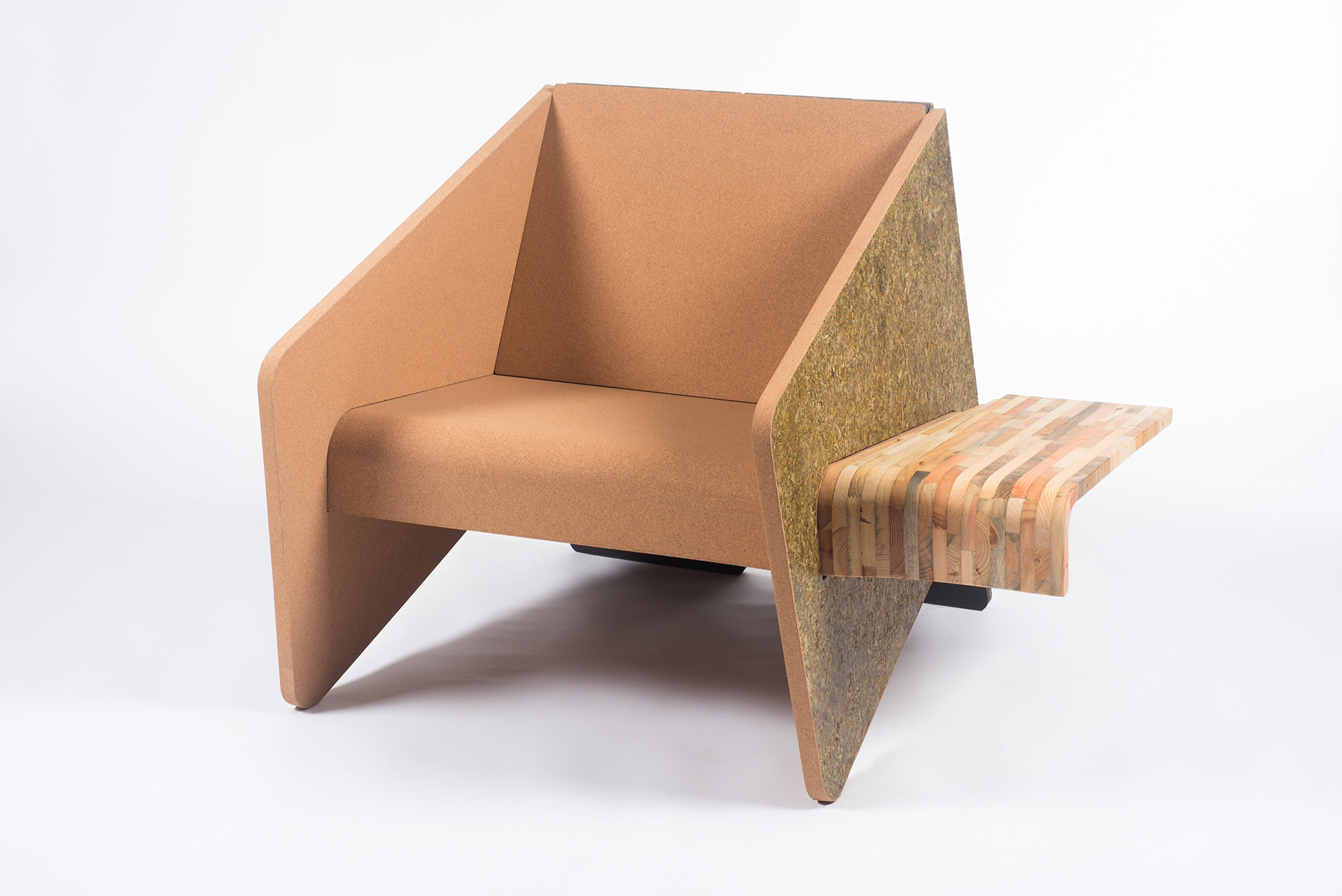 The Forest Chair was designed for the lounges of the 2021 Portuguese Presidency of the council of the European Union. The chair comes in 4 varieties based on the combination of materials that each unit utilizes: agglomerated cork or agglomerated toasted cork (both of which are the waste streams of the cork stoppers industry) for the inner lining, and with either eucalyptus leaves (waste from the paper industry) or forest clutter (waste from the forestry industry). The chair was designed for Covid-19 pandemic conditions and social distancing, and as such, each unit integrates its own side table – made from upcycled pine wood from broken cargo pallets.
