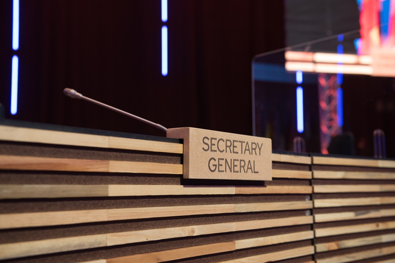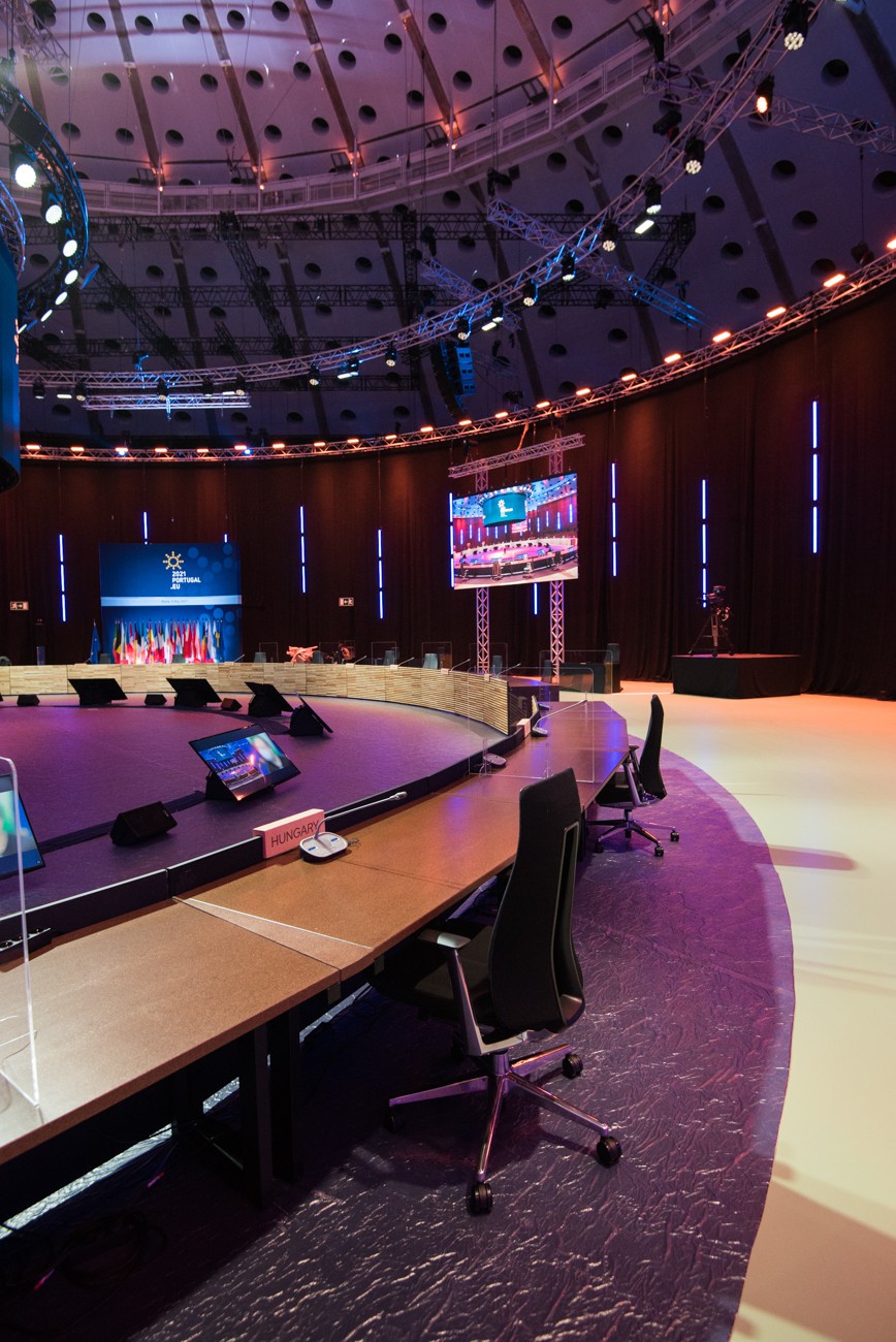 The PPUE 2021 Ministerial Table was first assembled at the CCB's Grand Auditorium in April 2021 in a rectangular format, comprising 44 tables. In line with the client's request, the front panel of the table modules was redesigned to comprise alternating lines of toasted cork and pine, which created a uniform, infinite structure. The legs were also redesigned in order to accommodate irregular seating positions. The public debut of the table was at the Informal Meeting of the Council of the European Union on May 8, 2021, in Porto at the Rosa Mota Pavillion, Super Bock Arena. Due to the unique circular structure of the Arena, extra parts were designed to allow the table to be attached in a circular layout with 34 tables. In addition to the extra parts, name plates for each of the countries and participants were produced in laser-engraved cork. The table was then transported to the city of Coimbra for the Informal Meeting of Ministers for EU Affairs and Foresight on 17 May 2021, and was set up in a rectangular format integrating 32 tables. After Coimbra, SUSDESIGN's ministerial table was set up back at the CCB's Grand Auditorium for various meetings on 27 May 2021, integrating 44 tables.
